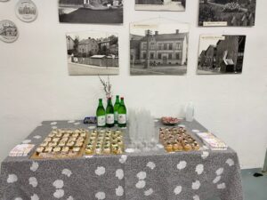 Bild 2: Dignande buffébord med bilder från Folkrörelsearkivet i Oskarshamn på väggen i bakgrunden